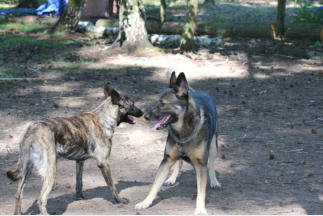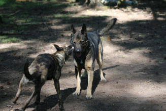 Lefzen ziehen, Zähne zeigen, Nackenhaare stellen, Schwanz wedeln usw. kommuniziert der